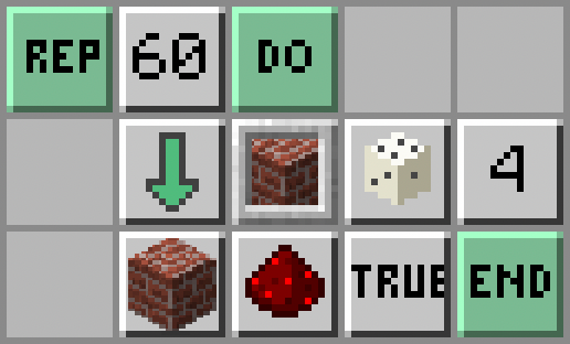 - Żółwik ruszy się do tyłu: Move Back; wylosuje bloki ze swojego ekwipunku ze slotów 1-4: Select Slot - Random Number - Number (4); i postawi blok przed sobą: Place; a następnie odpali TNT: Set Redstone (True)