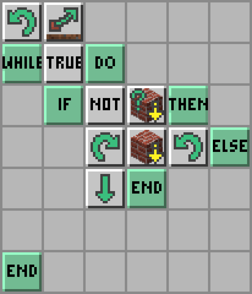 - Żółwik obróci się w prawo: Turn Right; postawi blok pod sobą: Place Down; i obróci się w lewo: Turn Left