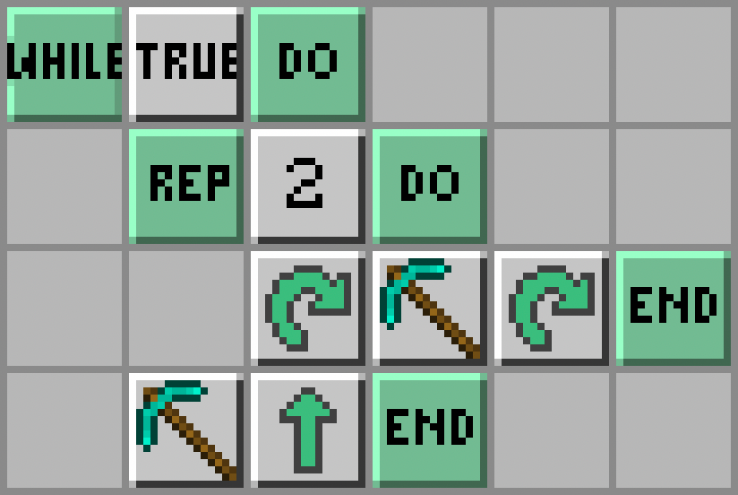 - Żółwik obróci się w prawo: Turn Right; wykopie blok przed sobą: Dig; i znów obróci się w prawo: Turn Right