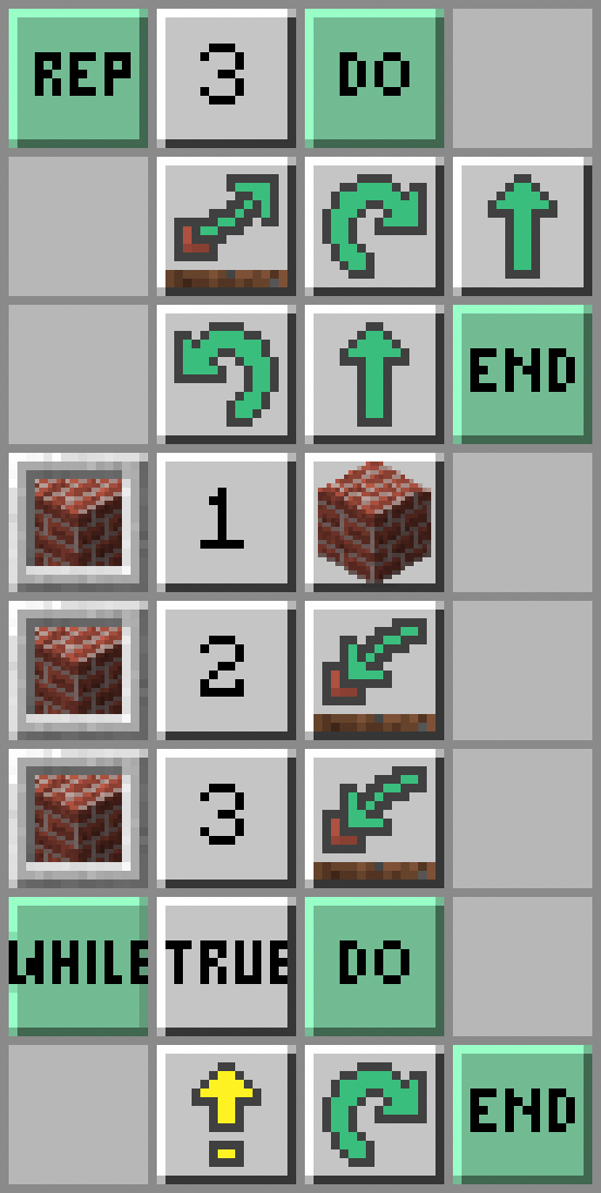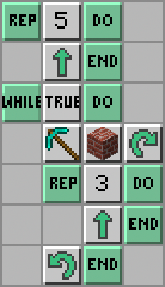 - Żółwik wykopie blok przed sobą: Dig; postawi blok przed sobą: Place; i obróci się w prawo: Turn Right
